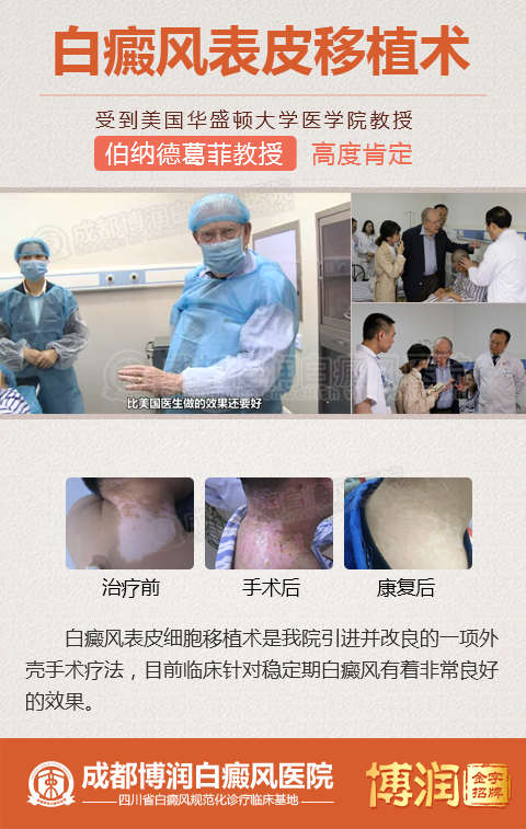 鉴于上述情况,为切实向患者提供科学规范化的诊疗,帮助患者尽快解除白斑困扰,树立治疗信心。四川省白癜风规范化诊疗临床基地——成都博润白癜风医院开展了9.10—9.25日“秋季表皮(黑色素)细胞移植征集活动”。以新型的外科祛白技术让广大久治不愈的白癜风患者体验快速祛白的快感。